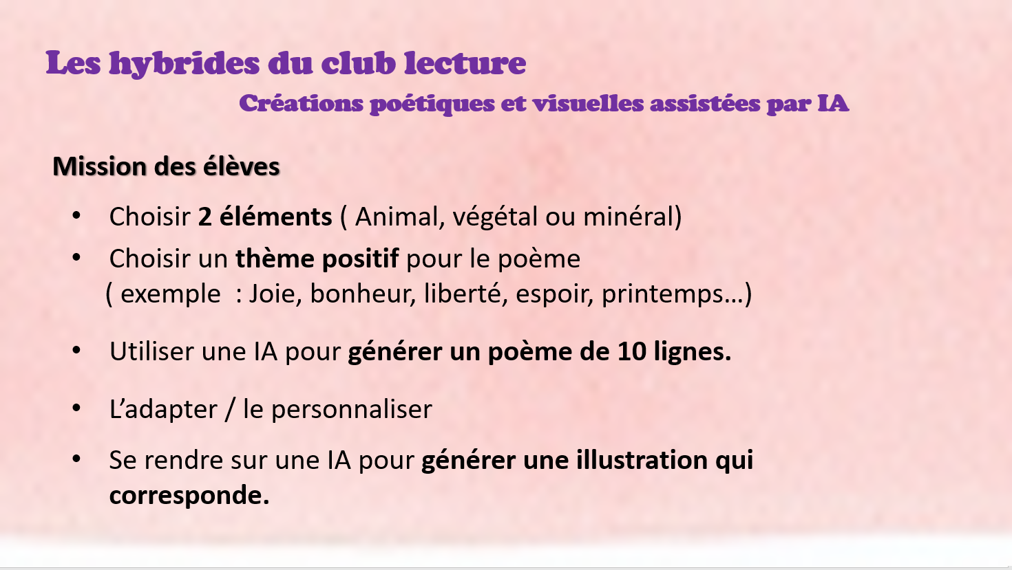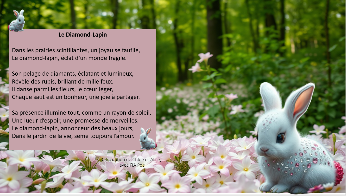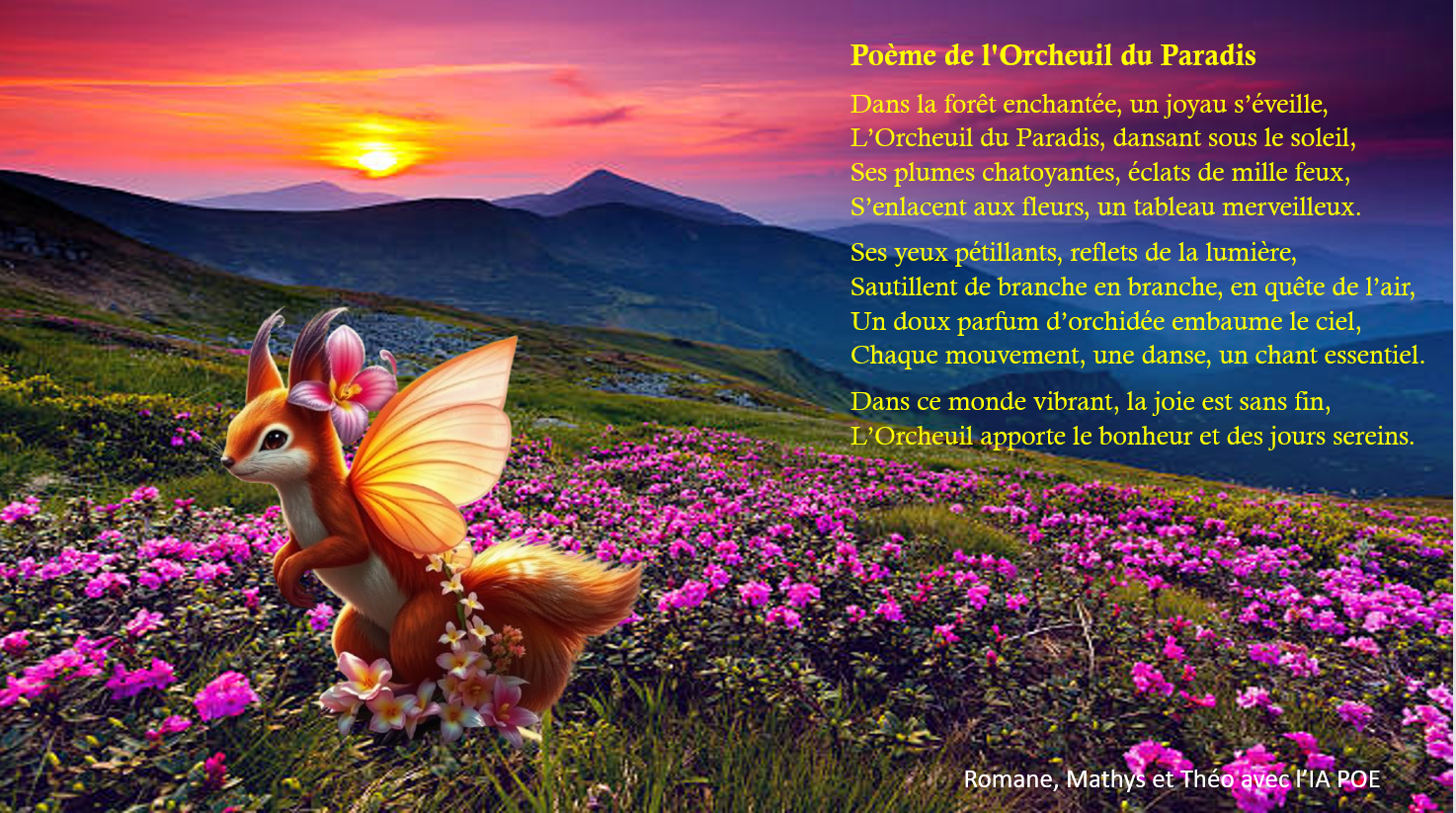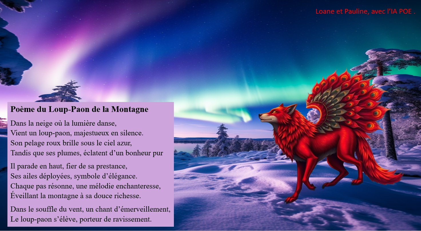 - Demandez à l’IA de votre choix de générer un poème, d’une dizaine de lignes, qui correspond à ce choix, (nom de votre hybride et thème du poème), essayez d’orienter l’IA pour avoir un poème selon vos attentes et adaptez la proposition qui vous est faite !