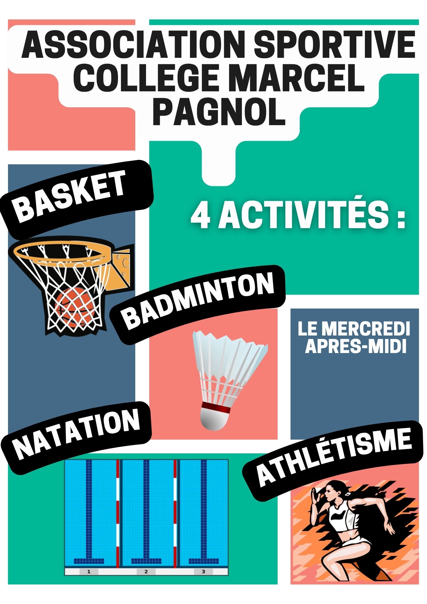 Le collège Marcel Pagnol propose 4 activités sportives sur le temps du mercredi après-midi :